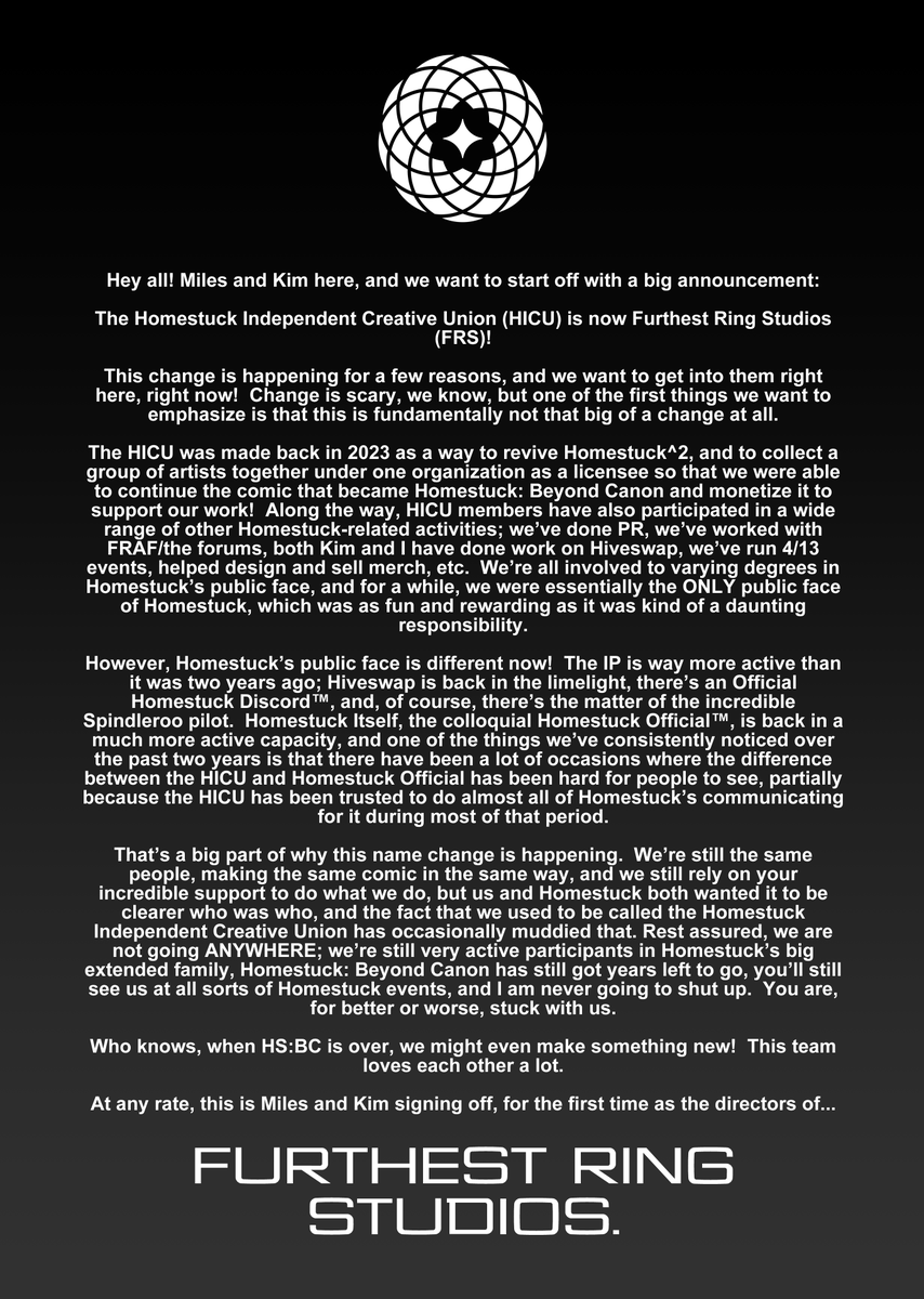Around October 2023 Andrew Hussie “restructured” Homestuck’s publishing agreement with Viz Media in order to reestablish their “control over the brand.” Homestuck then announced the relaunch of Homestuck^2: Beyond Canon, run by the also newly-announced Homestuck Independent Creative Union.